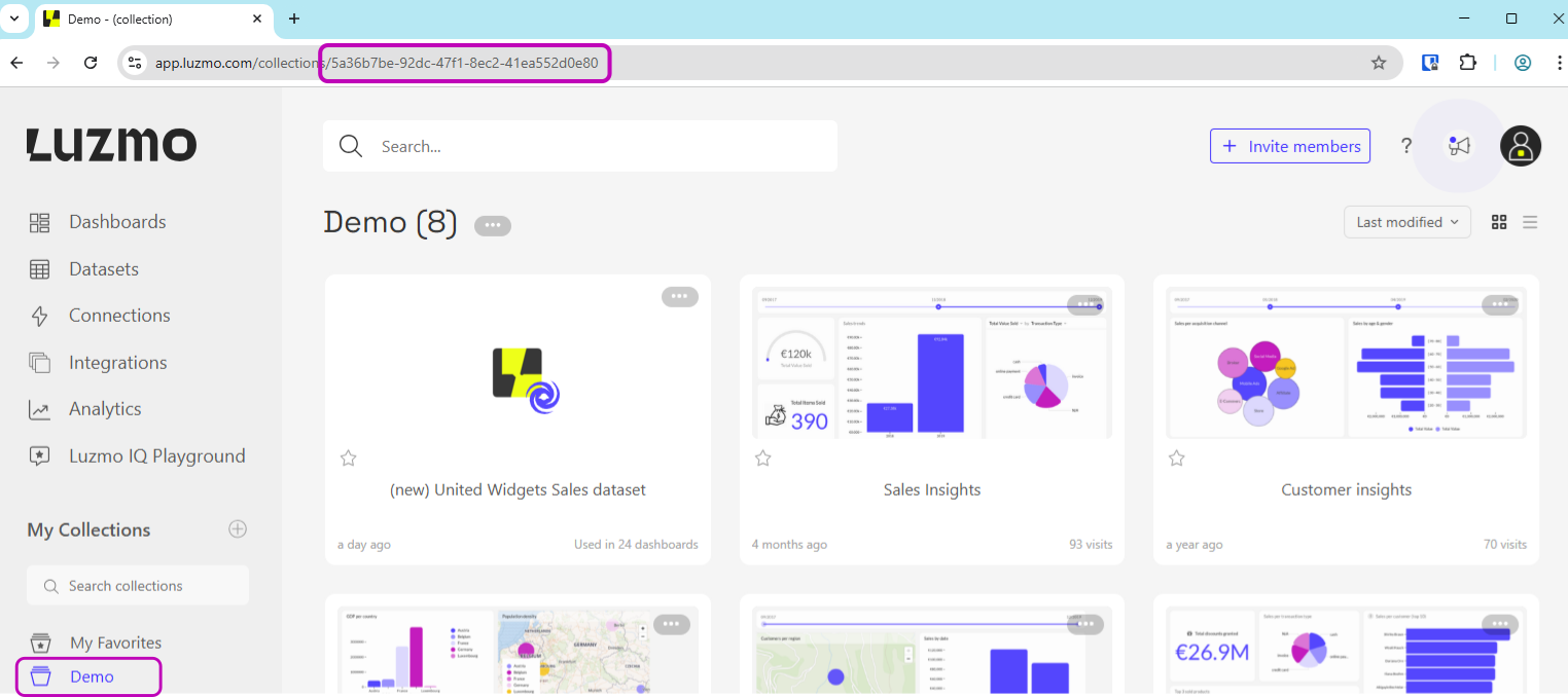 When creating an Embed token, you need to grant access to dashboards and datasets. To reference these dashboards and datasets, you need their unique ID's. In this section you will learn how you can find those ID's in our user interface for various entities.